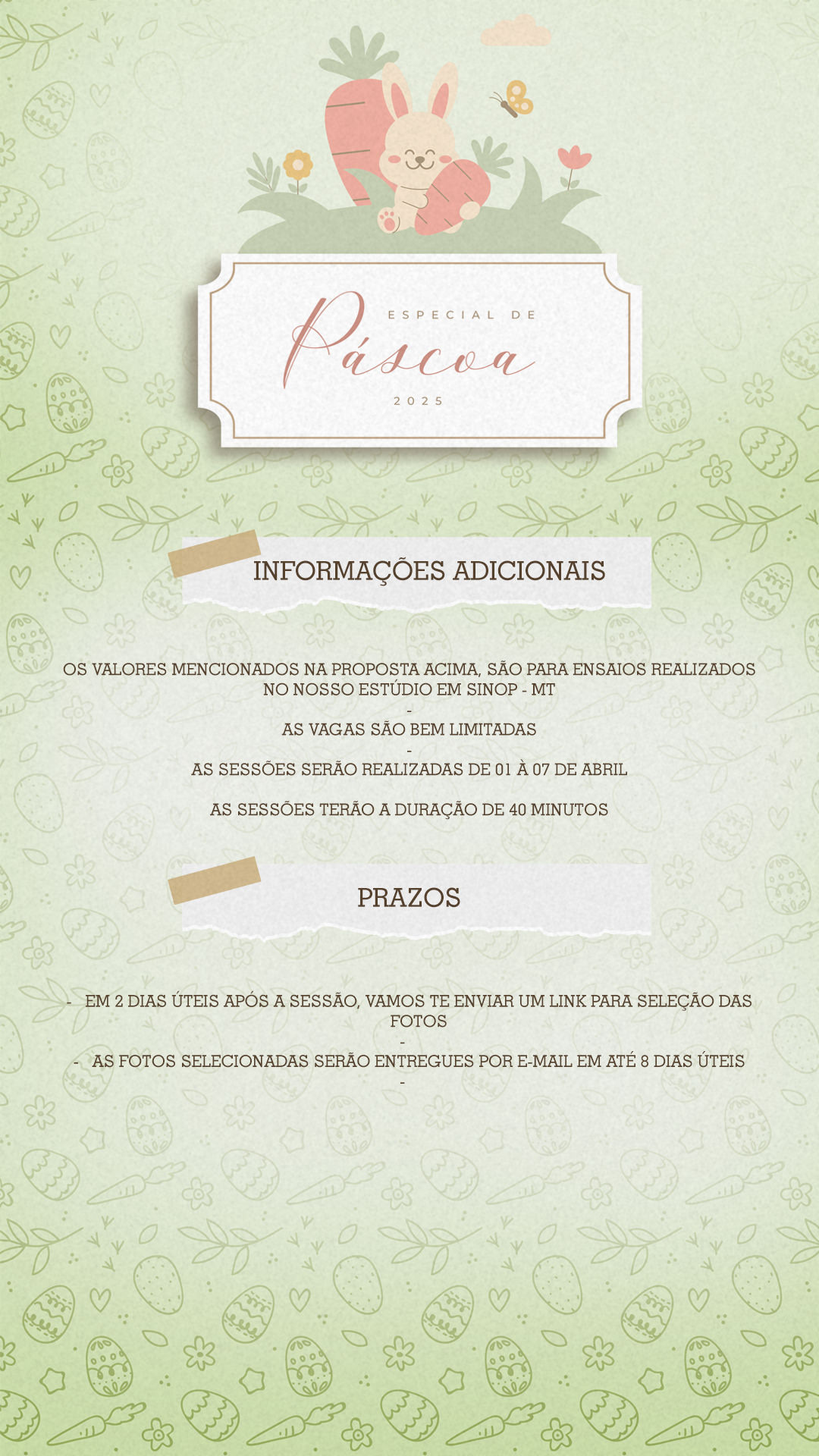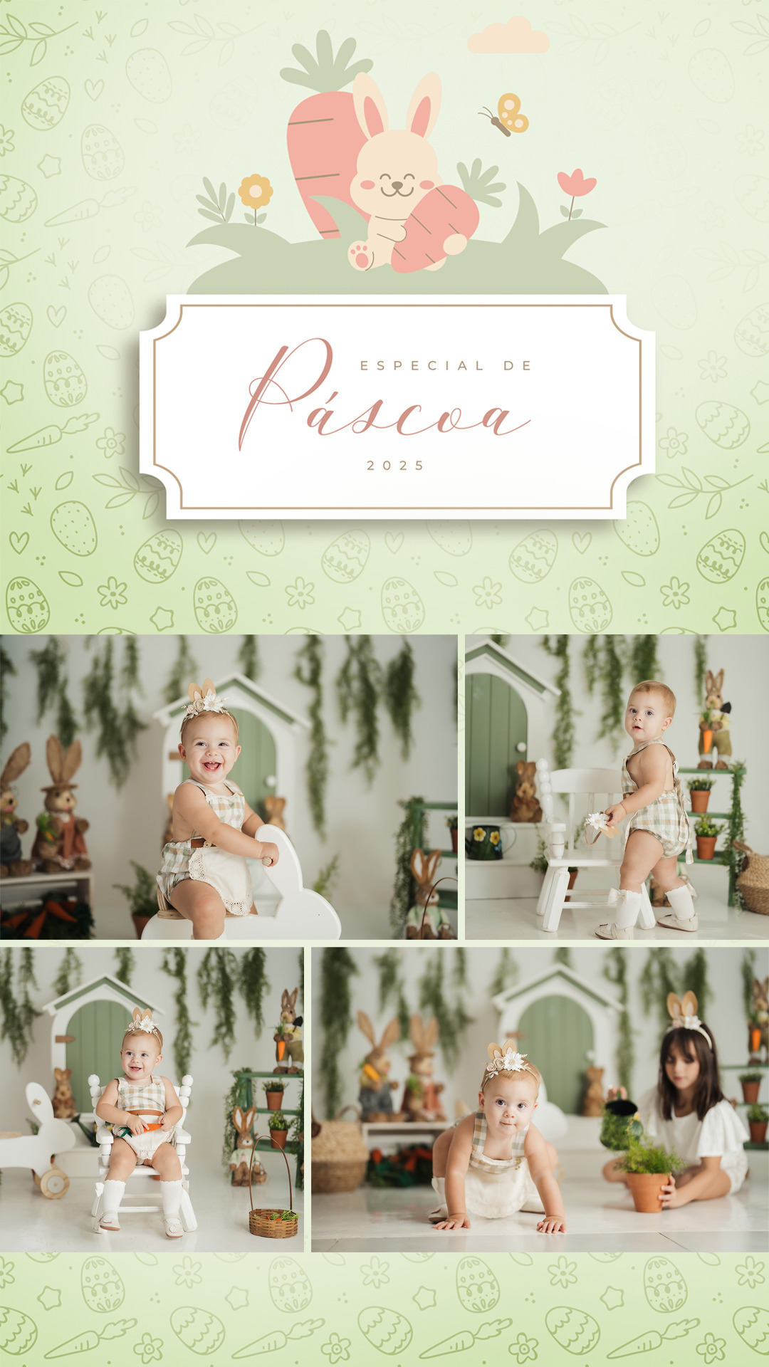 Nessa proposta do ensaio de páscoa terá roupinhas/orelhinhas para crianças de 2 meses até 12 meses, as demais idades deverão vir com o look que irá utilizar.